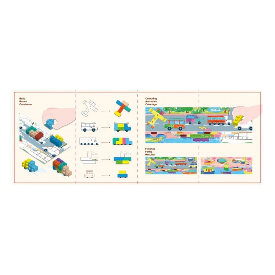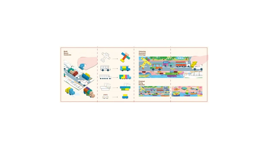 Mivel a készlet egyszerre vizuális (rajzolás) és aktív (építés) tevékenységre ösztönöz, hosszabb játékélményt biztosít és többféle módon leköti a gyereket.