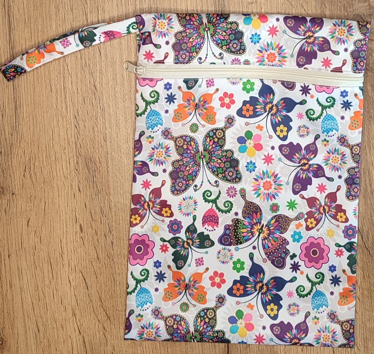 A Babychicks Vízhatlan pelenkazsák / tárolózsák - Pillangók egy praktikus kiegészítő a mindennapokra! A cipzáros záródással és praktikus füllel rendelkező tárolót bárhová felakaszthatod, és nemcsak női betétekhez vagy mosható pelenkákhoz használhatod, hanem akár ha uszodába vagy strandra mész, beleteheted a fürdőruhákat, de egy-egy utazás vagy kirándulás alkalmával a piszkos ruhákat vagy a nélkülözhetetlen kiegészítőket, kozmetikumokat is tárolhatod benne. A vízhatlan PUL réteg gondoskodik a nedves dolgok szivárgásmentes tárolásáról, így bátran elhelyezheted ezt a sokoldalú tárolózsákot a táskádban, garantáltan semmi sem lesz vizes!