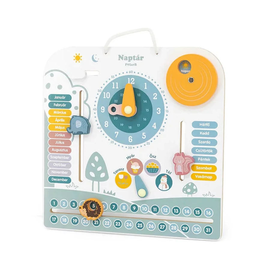 A naptár bemutatja a 12 hónapot, segítve ezzel a gyerekeket az év ciklikus szerkezetének megértésében. A négy évszak - tavasz, nyár, ősz, tél - sorrendje és jellemzői is könnyen megtanulhatóak a naptár által, és a hét napjainak sorrendjével is megismerteti a gyerekeket, ami segít a hétköznapi rutinok és a hét szerkezetének megértésében.