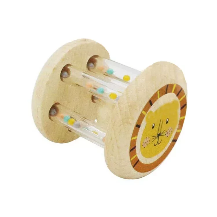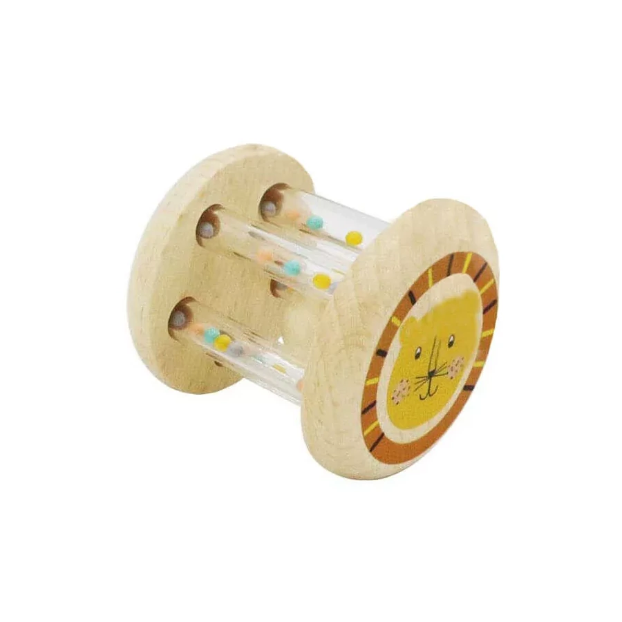 Fából készült natúr csörgő, cicával díszítve. Kis méretének köszönhetően könnyen kézbe tudják venni már a babák is. Az átlátszó hengerekben található színes golyócskák nem csak díszítőelemként szolgálnak, hanem ezek adják meg a csörgő hangját. Középen még egy nagy fagolyó is helyet kapott, amely még érdekesebbé teszi ezt a játékot. Gurítani is lehet, mellyel kúszásra, mászásra tudjuk ösztönözni a kicsiket. Játék közben fejlődik a finommotoros készség és szem-kéz koordináció.